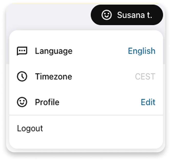 The last option available in this area will be labeled with the username. From here, you will be able to update your preferred setup for language and timezone and access your Profile settings.
