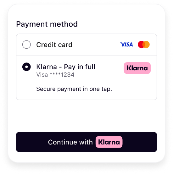 Enable Klarna in payment forms presented through hosted checkout pages or embedded elements using Klarna’s SDKs. This ensures a branded, compliant, and high-conversion checkout experience.