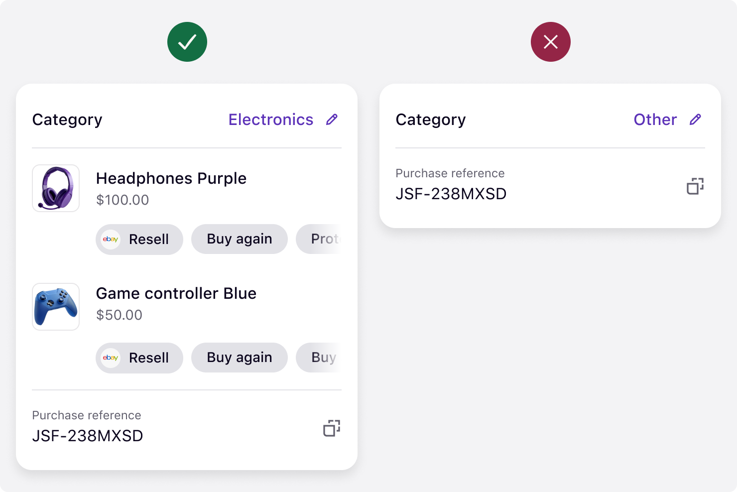 | Country of purchase | Must match across all requests |
