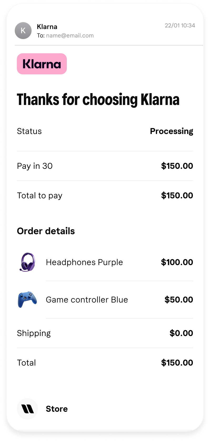 When you include product_url and image_url, Klarna displays the item visually across all customer-facing touchpoints, such as the Klarna app, emails, and web views.