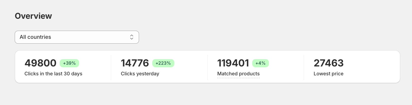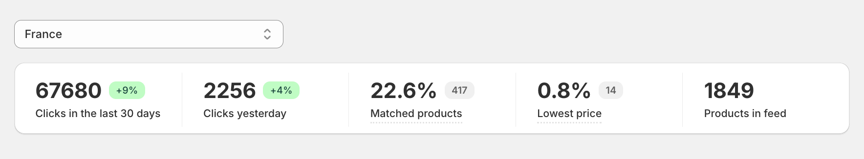 Here you can see country specific statistics and also the percentage of your products that have been matched and that are shown in the Klarna app and web.