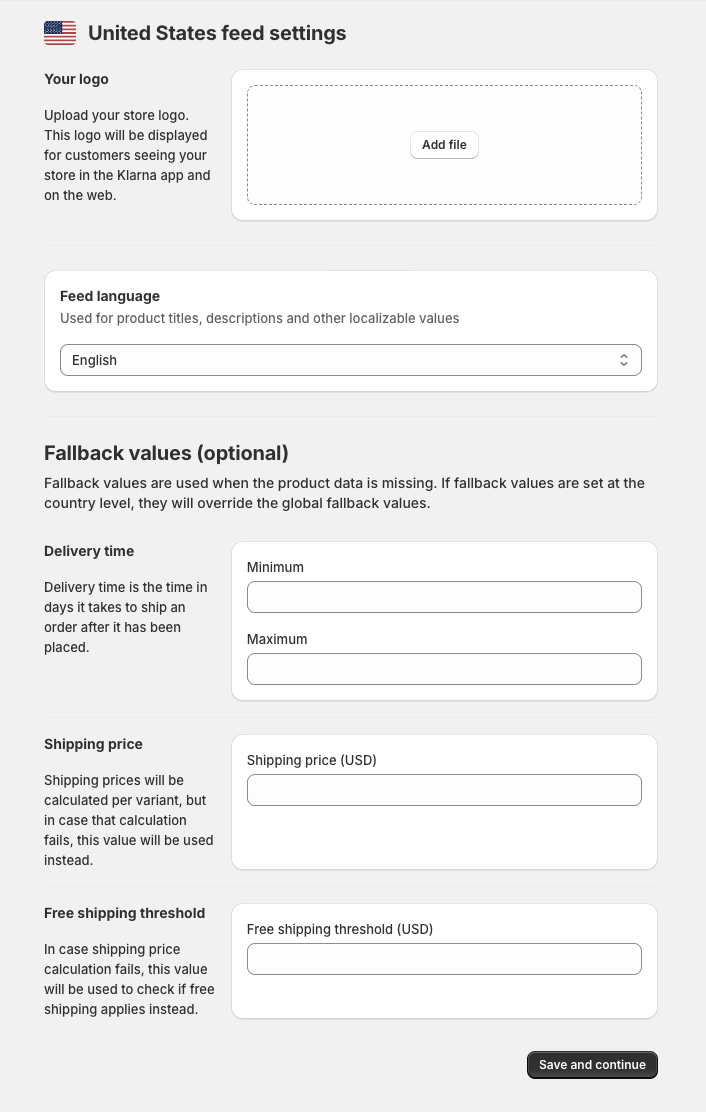 5. Choose a logo for your store. This will be shown in the Klarna app when merchants look at your store. Choose one that is squared. You can also add fallback values for shipping and delivery time for this specific feed, should those values not be available otherwise. There is also a field for adding free shipping above a certain threshold. For example, if you add 100 in the field in the example screenshot above, free shipping on orders above 100 EUR will be shown to customers as a fallback.